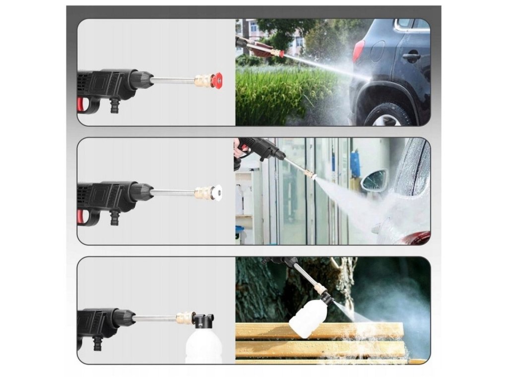 - Trysky: 3 různé trysky (vysokotlaká červená, vějířová bílá, pěnová láhev)