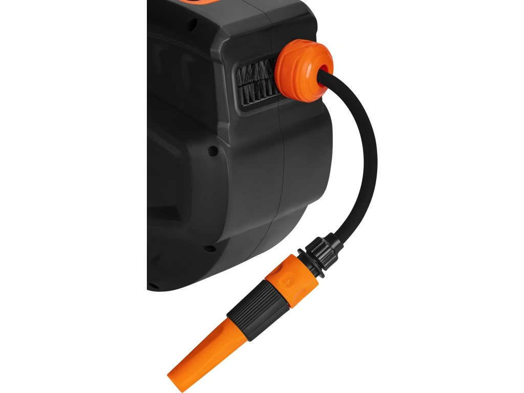 Naviják je určen pro montáž na stěnu a otočný držák umožňuje natáčení podle směru práce, takže hadice se přirozeně přizpůsobí pohybu při zalévání.