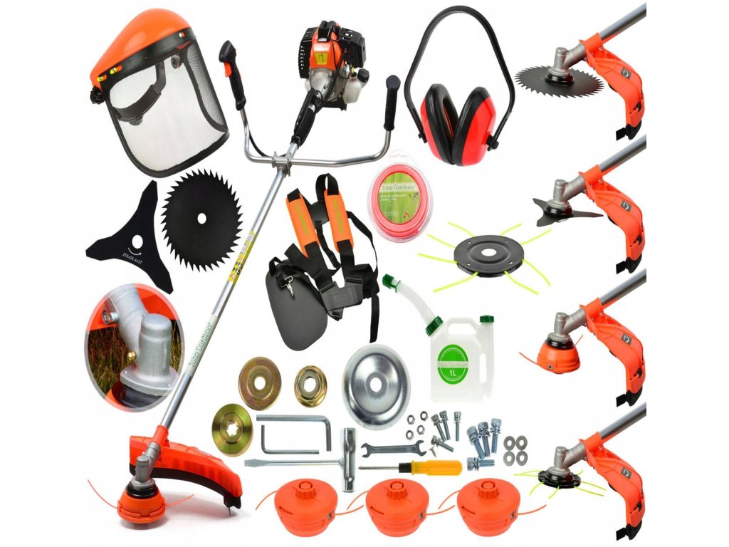 - Příslušenství: Bohaté příslušenství zahrnuje různé druhy nožů nebo strunových hlav pro různé úkoly řezání. Je k dispozici rozšířené příslušenství pro specifické úkoly, jako je řezání keřů nebo vyčištění okolí.