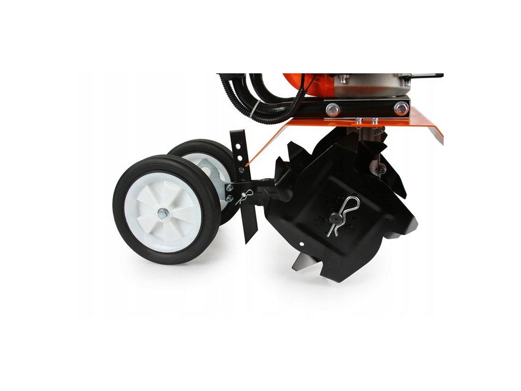 Stroj je vybaven ocelovými noži s možností záběru až 360 mm, které efektivně rozruší i tvrdší půdu. Ergonomická konstrukce a nastavitelná madla usnadňují manipulaci a ovládání.