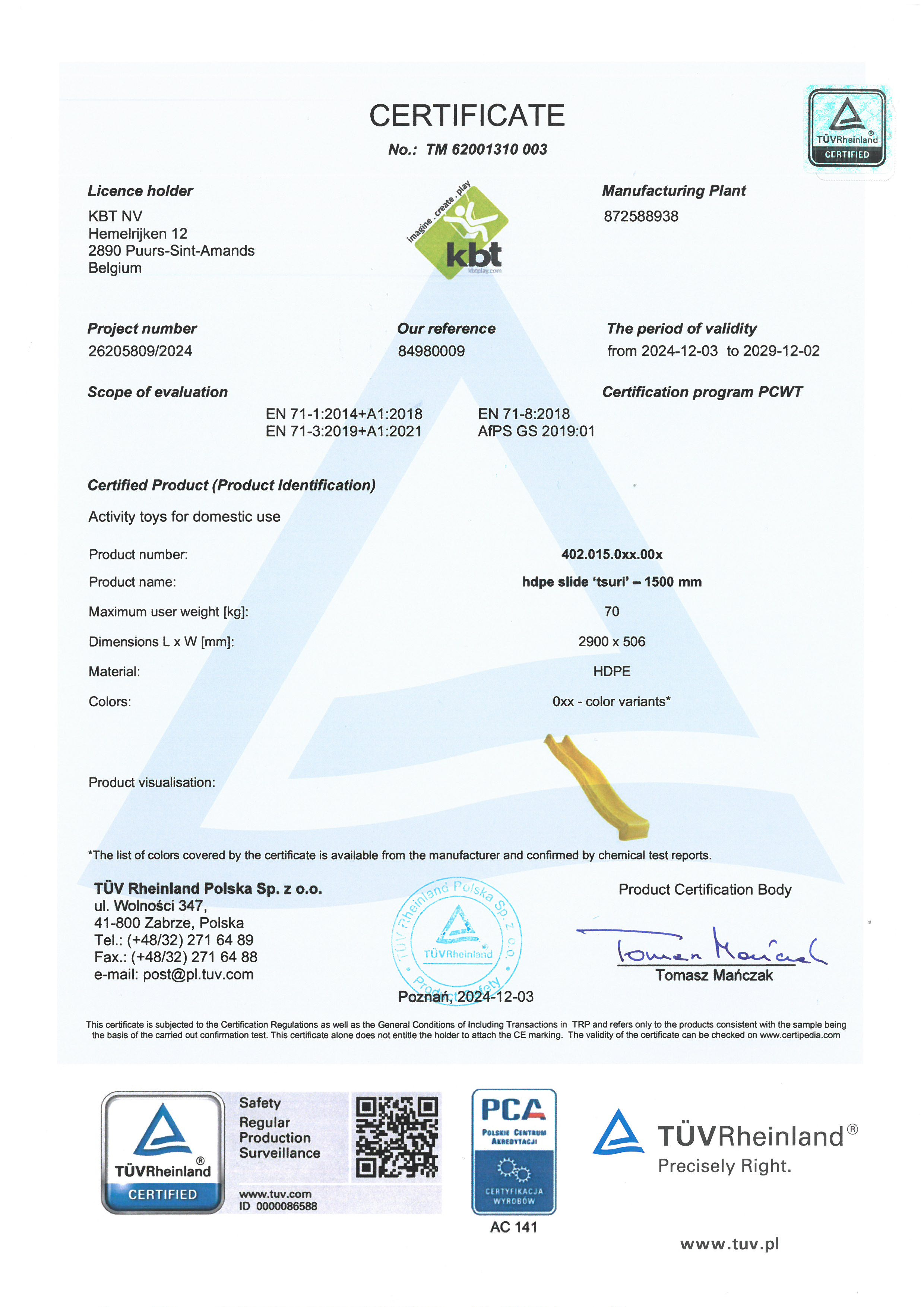 - Bezpečnost na prvním místě – splňuje normy EN 71-1-2-3-8 a má certifikát TÜV Nord.