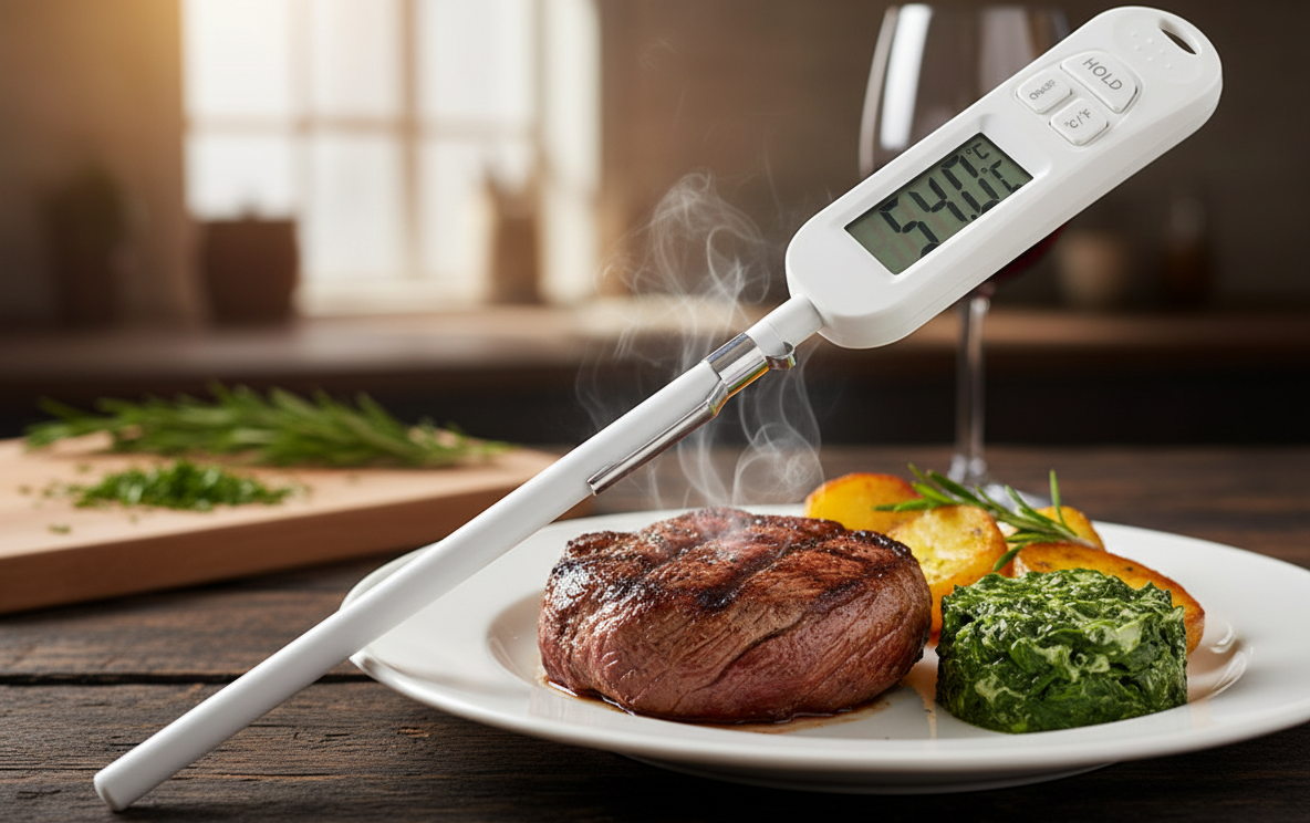 Digitální kuchyňský teploměr je praktický pomocník pro přesné měření teploty potravin, tekutin i vzduchu. Umožňuje snadnou kontrolu teploty masa, koláčů, grilovaných pokrmů, polévek nebo oleje při smažení. Díky rychlé odezvě a přehlednému LCD displeji je ideální pro každodenní použití v domácí i profesionální kuchyni.