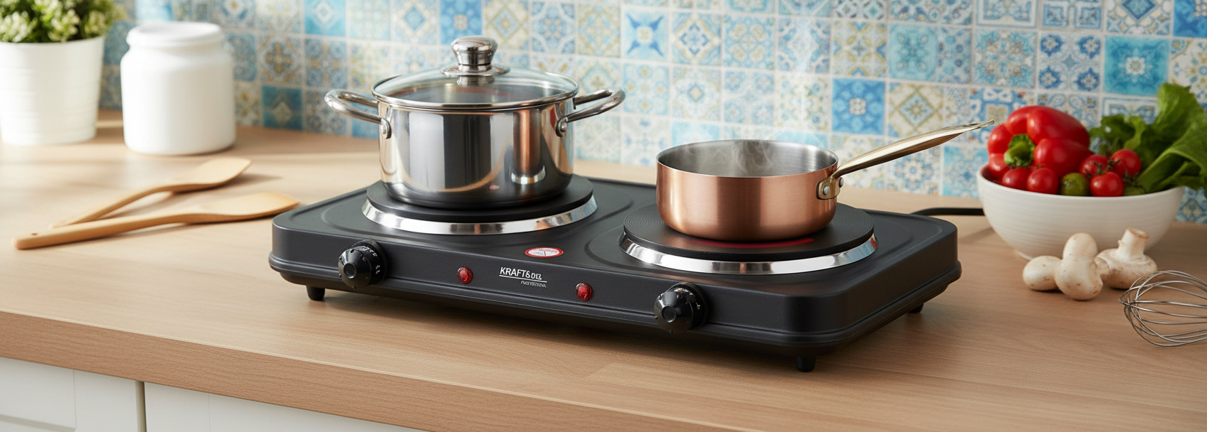 Elektrický vařič je praktický dvouplotýnkový sporák s výkonem 2600 W, ideální pro malé kuchyně, kanceláře, chaty nebo jako doplňkový zdroj vaření. Díky dvěma topným plotýnkám o průměru 155 mm a 185 mm umožňuje současnou přípravu více jídel s možností nezávislé regulace teploty pro každou z nich. Kompaktní konstrukce, snadné ovládání a LED kontrolky zajišťují pohodlí i bezpečnost při používání.