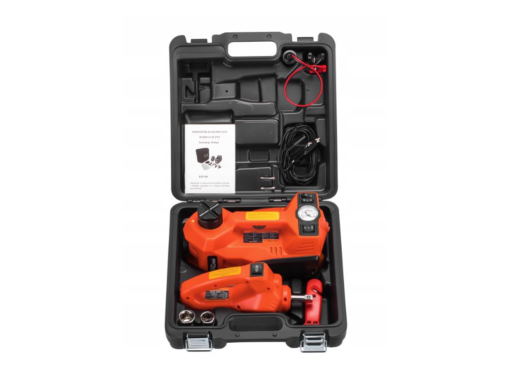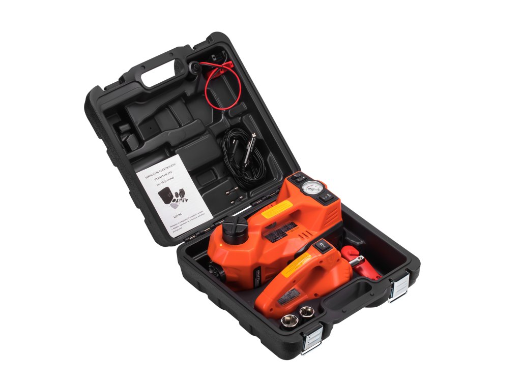 Sada KD1368 KRAFT&DELE je ideálním řešením pro všechny řidiče, kteří chtějí mít vždy po ruce spolehlivého pomocníka při výměně kola nebo řešení nouzové situace. Hydraulický autozvedák s elektrickým pohonem a vestavěným kompresorem umožňuje rychlé a bezpečné zvednutí vozidla až do 5 tun. Rázový utahovák v sadě usnadňuje demontáž kol a jeho dlouhý napájecí kabel (3 m) zajistí pohodlný dosah ke všem kolům.