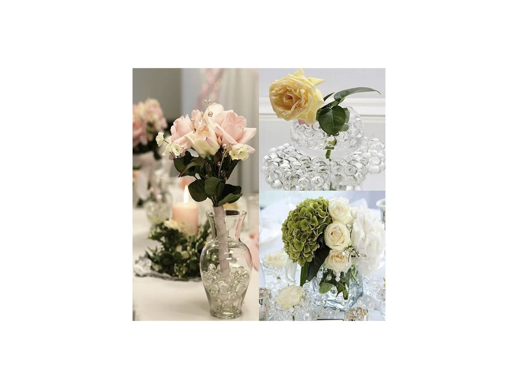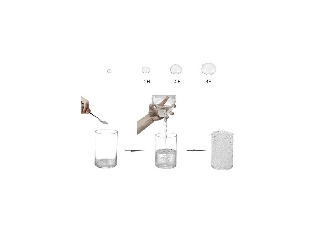 Průhledné hydrogelové kuličky jsou praktickým a zároveň dekorativním řešením pro uchovávání vody, hydrataci rostlin i tvorbu originálních interiérových doplňků. Po namočení do vody během několika hodin výrazně zvětší svůj objem, zprůhlední a vytvoří esteticky působivý efekt. Díky své schopnosti dlouhodobě zadržovat vodu představují nejen vizuální prvek, ale také funkční pomůcku pro péči o rostliny nebo výrobu přírodních osvěžovačů vzduchu.