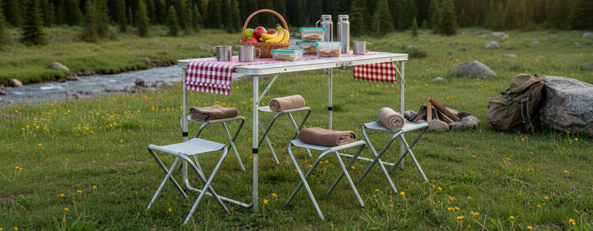 Kempingový skládací stůl s čtyřmi židlemi je ideálním řešením pro rodinné výlety, pikniky nebo zahradní párty. Tento praktický a kompaktní set nabízí vše, co potřebujete pro pohodlné posezení venku.