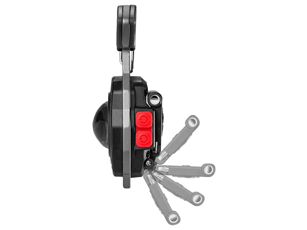 Funkce: světlo, zapalovač, otvírák na lahve, karabina, magnet, píšťalka, nůž, křížový a plochý šroubovák