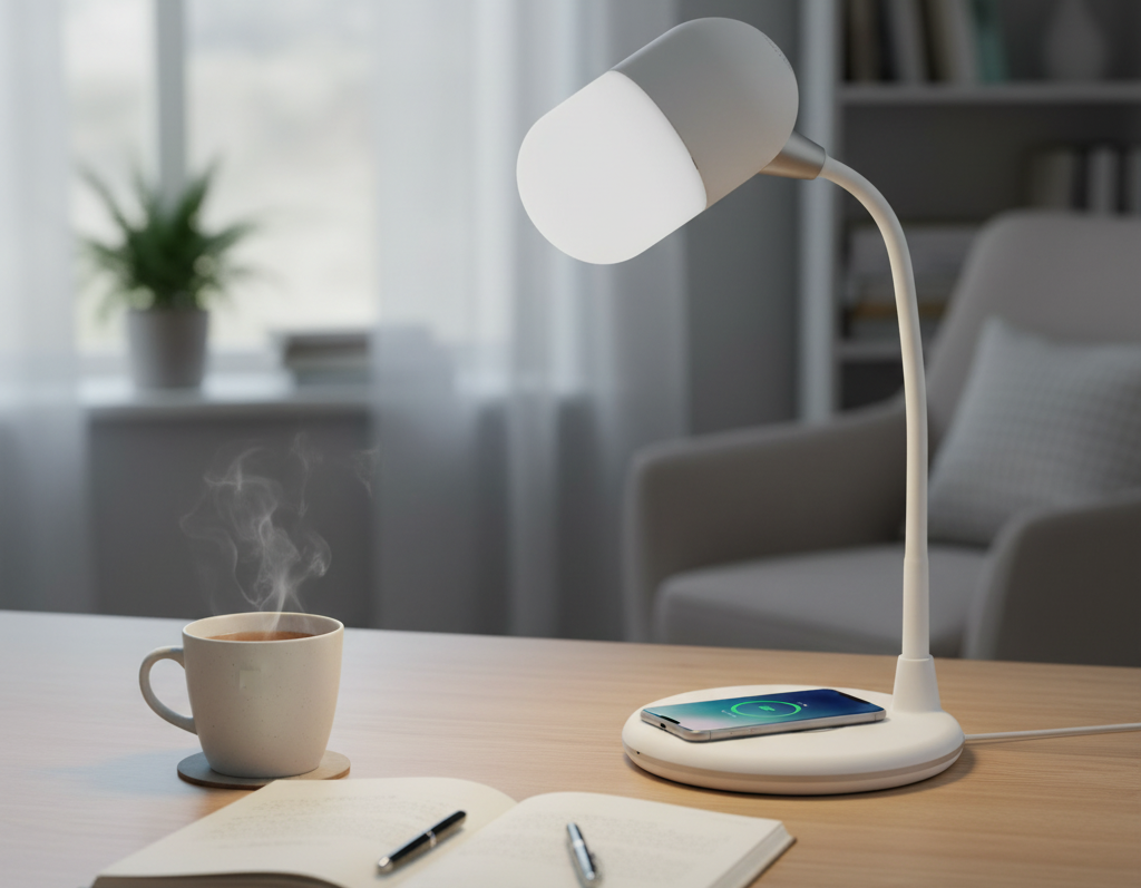 Moderní stolní lampička kombinuje hned tři praktické funkce v jednom zařízení – LED osvětlení, bezdrátovou nabíječku a Bluetooth reproduktor. Je ideální na pracovní stůl, noční stolek i do studentského pokoje. Šetří místo, omezuje množství kabelů a zároveň poskytuje příjemné světlo i možnost přehrávání hudby.