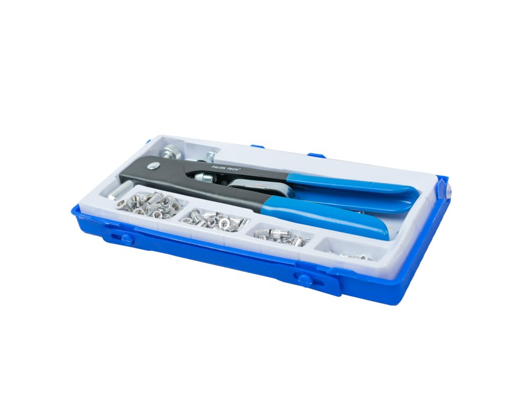 Nýtovací kleště na matice jsou ideální pro zatloukání závitových nýtů do tenkých materiálů, jako je plech, plast a sklolaminát, široce se používá při montáži a různých opravách automobilů, výtahů, spínačů, přístrojů, nábytku, dekorací a elektrických strojů apod. Uvnitř kleští je pevné posuvné pouzdro pro snadné vyjmutí nebo výměnu šroubů. Kleště mají pouzdro z vysoce legovaného hliníku litého pod tlakem, pohodlnou rukojeť, výměnné hlavy ve velikostech: M3, M4, M5, M6, M8. Celá sada je zabalena v praktickém kufříku.