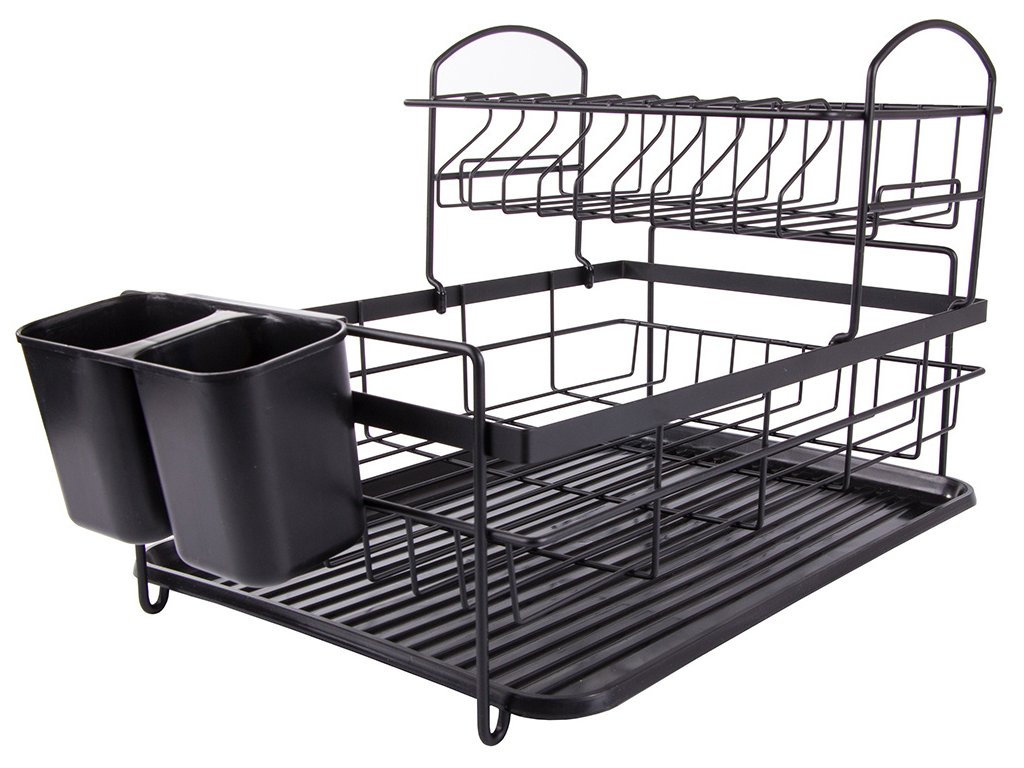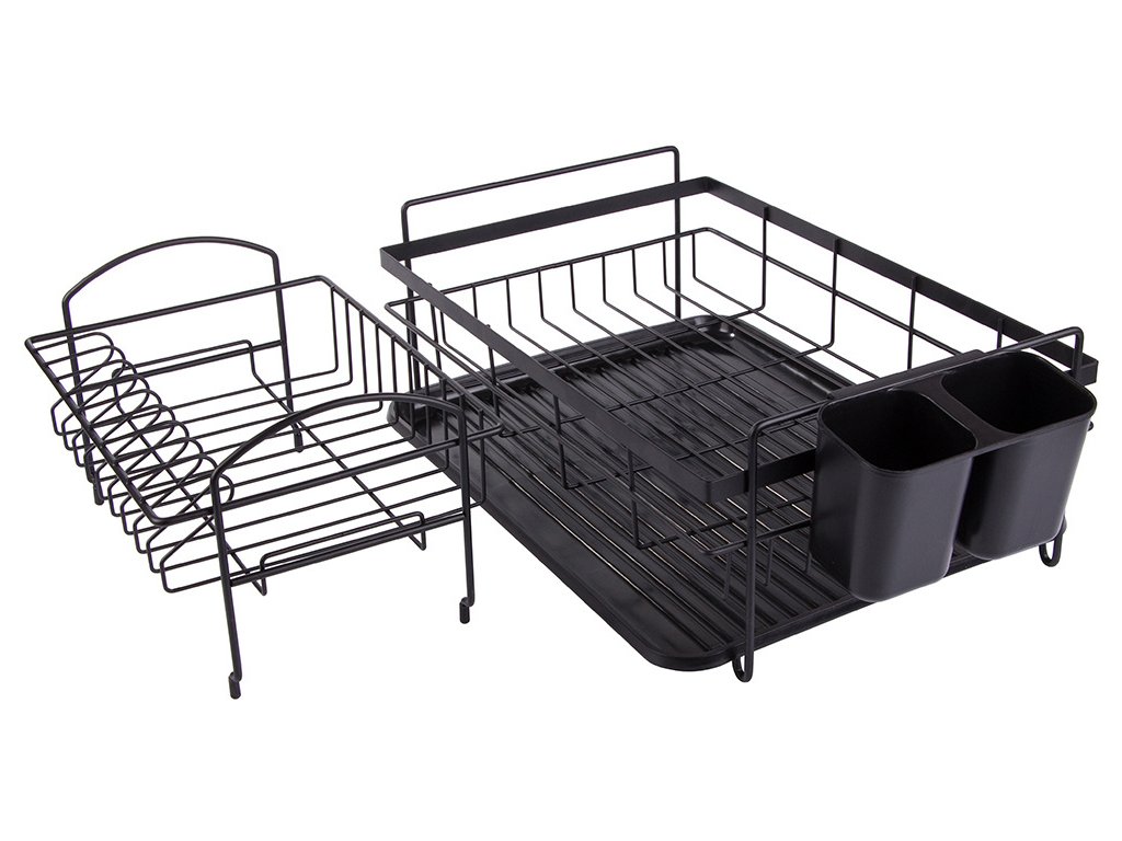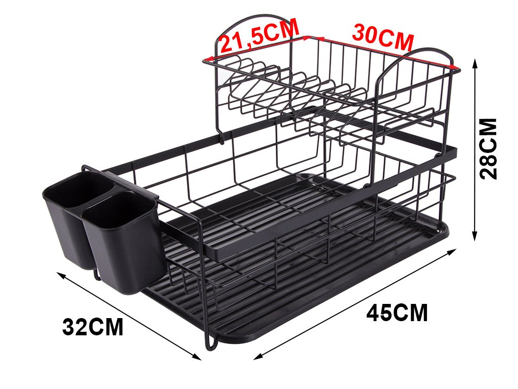 Odkapávač na nádobí s miskou je praktický dvoupatrový sušák vyrobený z odolného kovu s práškovou úpravou, který odolává vlhkosti i každodennímu používání. Jeho pevná konstrukce umožňuje efektivní sušení velkého množství nádobí bez rizika poškození kuchyňské linky díky plastové odkapávací misce.