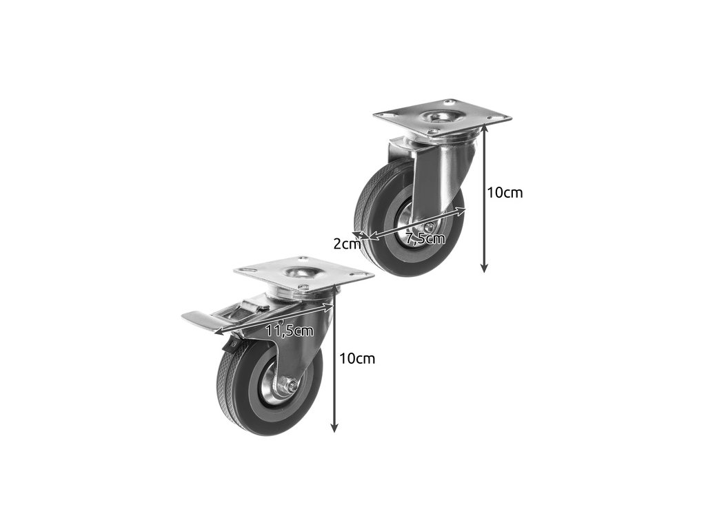- Počet koleček: 4 ks (2× s brzdou, 2× bez brzdy)