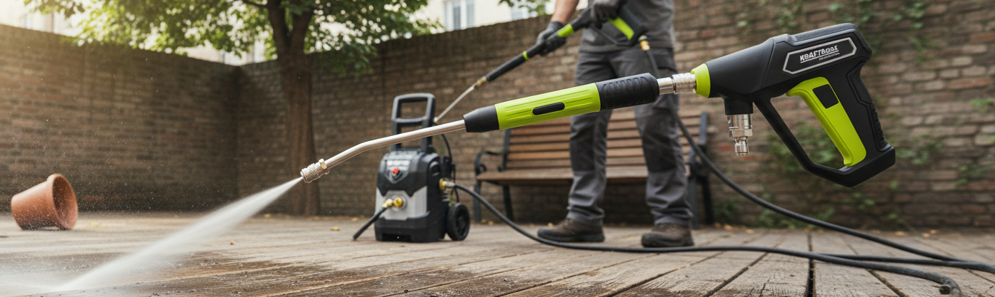 Pistole je vhodná pro domácí i profesionální využití – od mytí automobilů až po čištění fasád, teras či průmyslových zařízení.