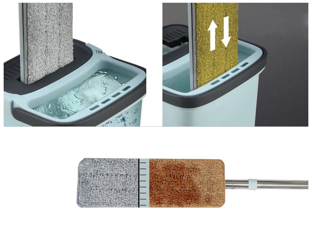 Plochý mop se ždímacím kbelíkem je moderní a efektivní úklidový nástroj určený pro všechny typy podlah. Díky systému dvoukomorového kbelíku s oddělenou sekcí na oplach a ždímání vám umožní udržovat mop čistý a zároveň účinně odstraňovat nečistoty bez kontaktu s vodou. Lehký a praktický design zajišťuje snadné používání a maximální komfort při každodenním úklidu.