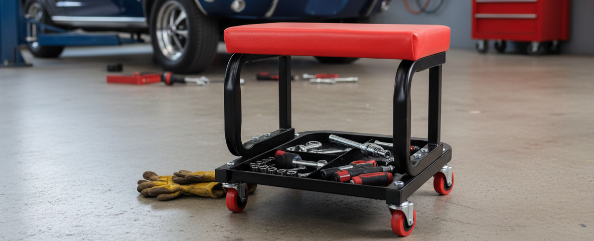 Pohodlné sedadlo potažené příjemným, odolným a snadno omyvatelným materiálem. Pojízdná dílenská stolička poskytuje pohodlí i při dlouhodobé činnosti. Stolička je díky hliníkovému skeletu velmi odololná s dlouhou životností. Součástí poličky je i polička vhodná na nářadí, klíče a šrouby, které používáme při práci. Stolička je usazena na 4 pevných otočných kolečkách, díky čemuž je snadné s celou stoličkou a v sedě pohybovat.