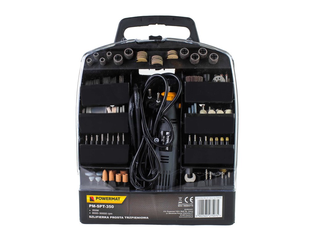 Přímá bruska s regulací otáček PM-SPT-350 Powermat je dodávána v sadě včetně bohatého příslušenství, díky kterému můžete vrtat, brousit a kartáčovat. Bruska je vybavena sklíčidlem (rychlouvolňovací), na které můžete připevnit různé hroty. Díky regulaci otáček můžete přizpůsobit pracovní rychlost vůči druhu zpracovávaných materiálů. Bruska s regulací otáček je ideálním zařízením pro práci v dílnách, kde můžete provádět broušení, rytí, leštění, frézování a šperkařství, modelování a hobby práce.     Sada obsahuje mnoho prvků, díky kterým si vyberete hrot, který ke své práci potřebujete. Vše v praktickém plastovém úložném boxu. Plastové pouzdro je zabaleno v kartonové krabici. Složení: