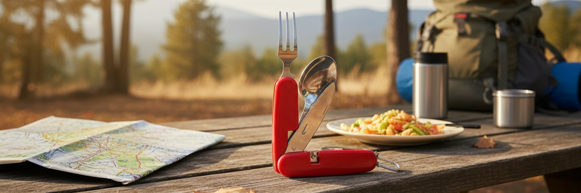- Multifunkčnost: Obsahuje vidličku, lžíci, nůž a otvírák na lahve.