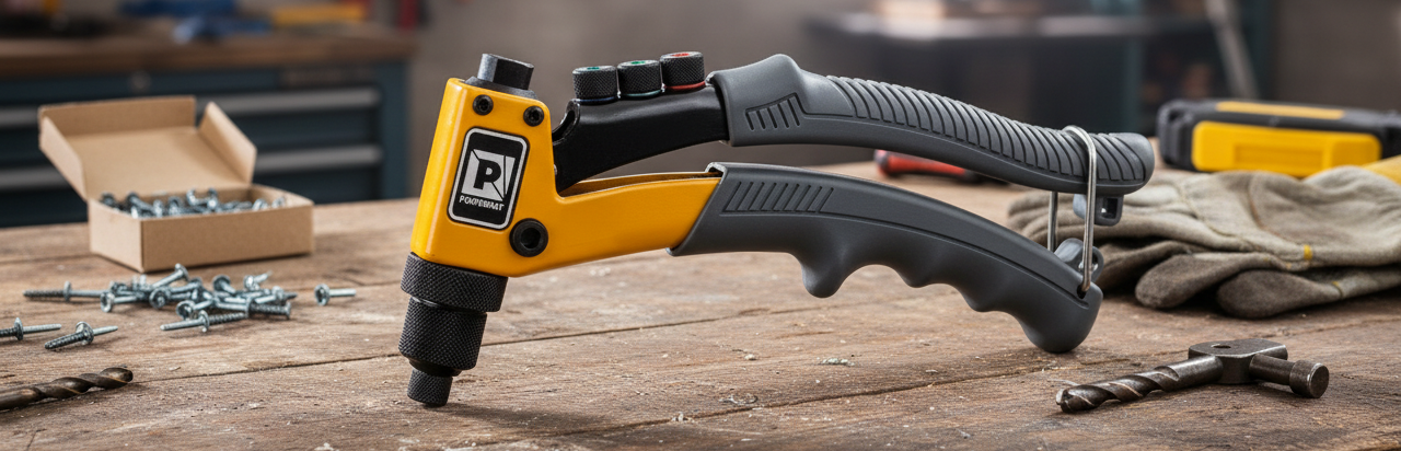 Ruční nýtovací kleště PM-NIR-200T značky Powermat jsou určeny pro práci se slepými nýty v nejběžnějších průměrech 2,4–4,8 mm. Díky kompaktní konstrukci, nízké hmotnosti a manuálnímu provozu jsou ideální pro montážní, servisní i opravárenské práce v dílně i terénu. Robustní konstrukce zajišťuje efektivní přenos síly a rovnoměrné vytvoření pevného a trvanlivého spoje bez nutnosti svařování nebo závitování.