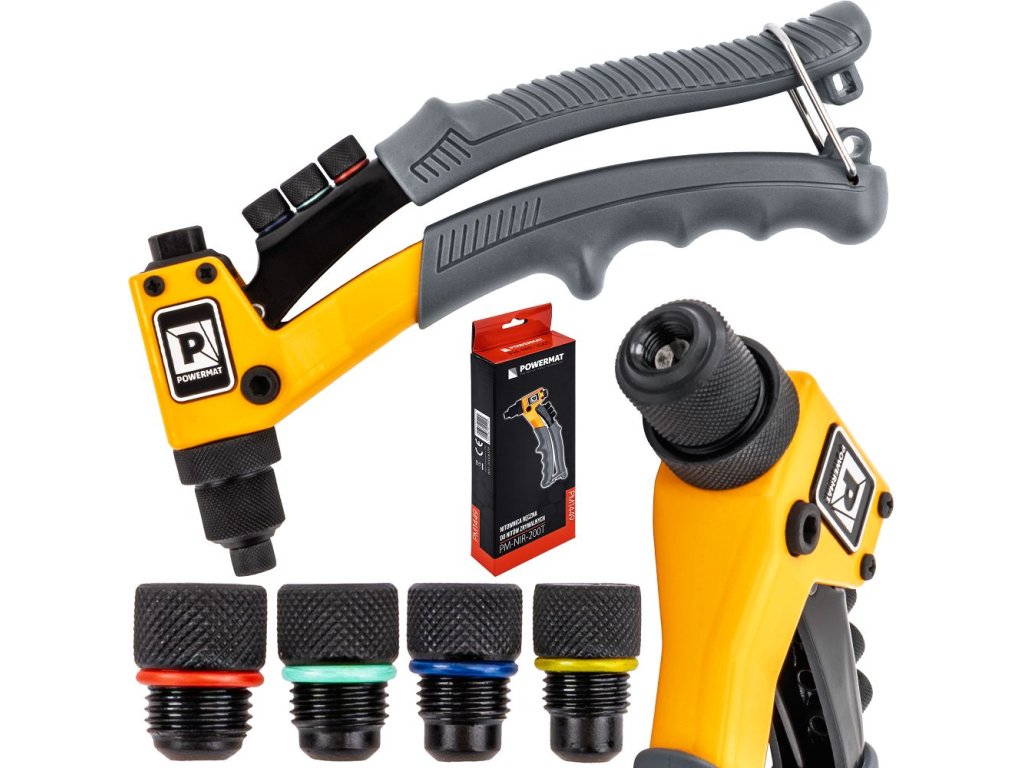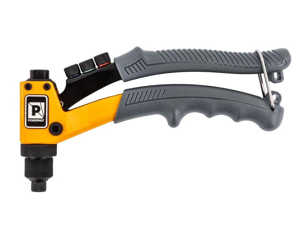 Ruční nýtovací kleště PM-NIR-200T značky Powermat jsou určeny pro práci se slepými nýty v nejběžnějších průměrech 2,4–4,8 mm. Díky kompaktní konstrukci, nízké hmotnosti a manuálnímu provozu jsou ideální pro montážní, servisní i opravárenské práce v dílně i terénu. Robustní konstrukce zajišťuje efektivní přenos síly a rovnoměrné vytvoření pevného a trvanlivého spoje bez nutnosti svařování nebo závitování.