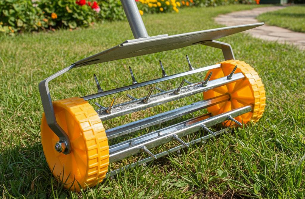 Ruční provzdušňovač trávníku POWERMAT na kolečkách je určený pro provzdušňování trávníku propichováním půdy hroty. Provzdušňovač je nepostradatelný pro údržbu okrasných trávníků. Provzdušňování trávníku je ošetření provzdušňováním trávy, které by se mělo provádět dvakrát za sezónu. Tím je prokypření a provzdušnění půdy.