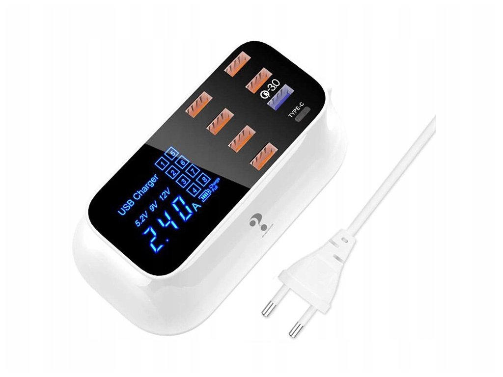 Rychlonabíječka 8× USB QC 3.0 40 W je ideálním řešením pro uživatele, kteří potřebují spolehlivě a bezpečně nabíjet více zařízení najednou. Díky inteligentnímu řízení výkonu, rychlonabíjecí technologii a přehlednému displeji nabízí vysoký komfort používání doma i v kanceláři.