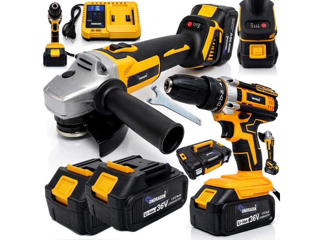 Praktická akumulátorová sada ONDRAGON OD9139 obsahuje dva výkonné pomocníky pro dílnu i stavbu – bezkartáčovou úhlovou brusku a aku příklepovou vrtačku/šroubovák. Oba nástroje jsou napájeny 36V Li-Ion bateriemi, což zajišťuje silný výkon, dlouhou výdrž a práci bez kabelů. Sada je vhodná pro řezání, broušení, vrtání i šroubování v různých materiálech.