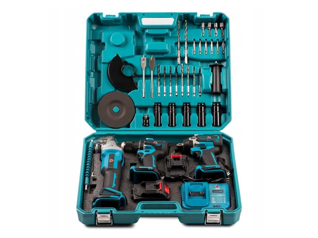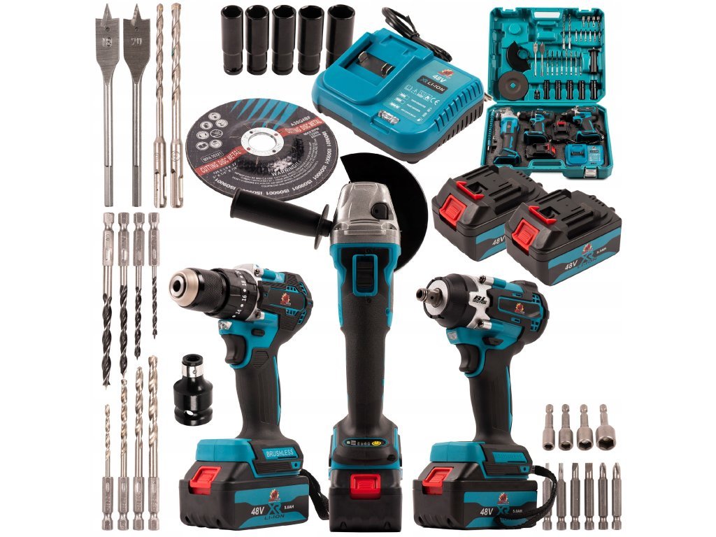 Profesionální sada aku nářadí 3v1 kombinuje aku vrtačku/šroubovák, úhlovou brusku a rázový utahovák v jednom praktickém kufru. Díky dvěma 48V Li-ion bateriím s kapacitou 5,0 Ah máte vždy k dispozici dostatek energie pro náročnou práci. V sadě najdete i bohaté příslušenství, které zajišťuje všestranné využití v dílně i doma.