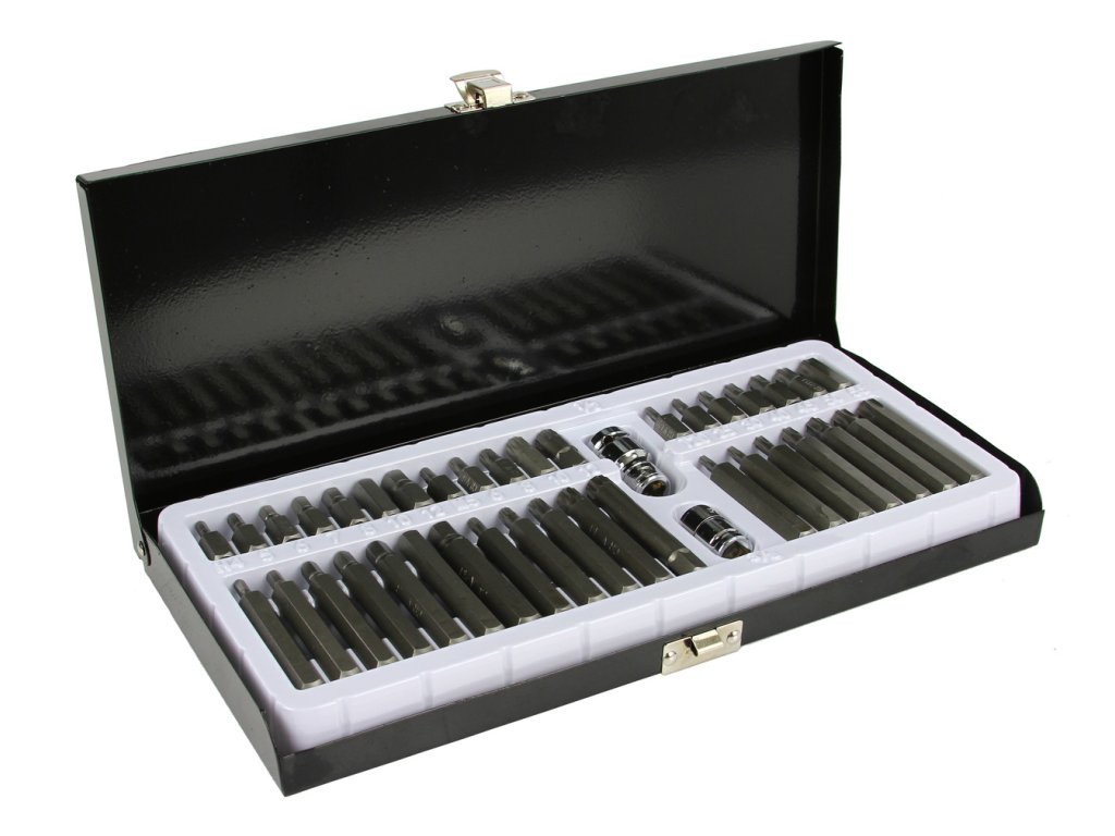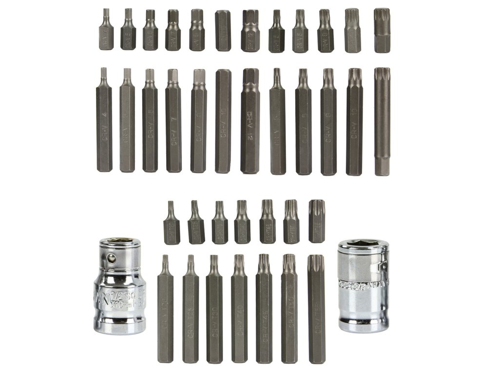 Sada bitů TORX 40ks nabízí širokou nabídku nástrčných klíčů a bitů, které vám umožní udělat spoustu práce v dílně a nebo autoservisech. Použití dvou adaptérů v sadě 1/2" a 3/8" umožní bezpečnou a různorodou práci.