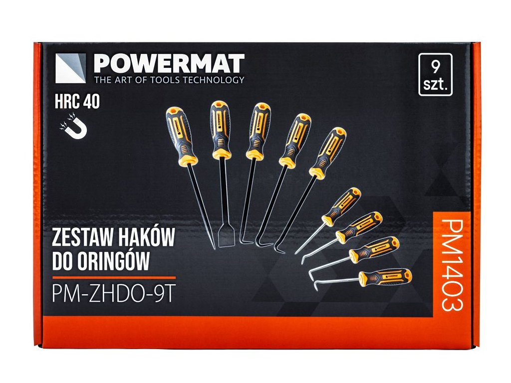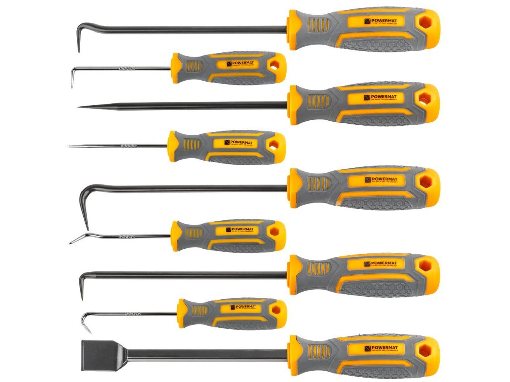 Sada háčků a páčidel 9 ks PM-ZHDO-9T od značky POWERMAT je profesionální sada nástrojů určená pro přesnou montáž a demontáž O-kroužků, těsnění a dalších drobných součástí. Nástroje jsou vyrobeny z kalené oceli s tvrdostí 40 HRC, což zajišťuje vysokou odolnost proti opotřebení i při intenzivním používání. Díky různým tvarům hrotů a ergonomickým protiskluzovým rukojetím je práce přesná, bezpečná a pohodlná i ve stísněných prostorech.