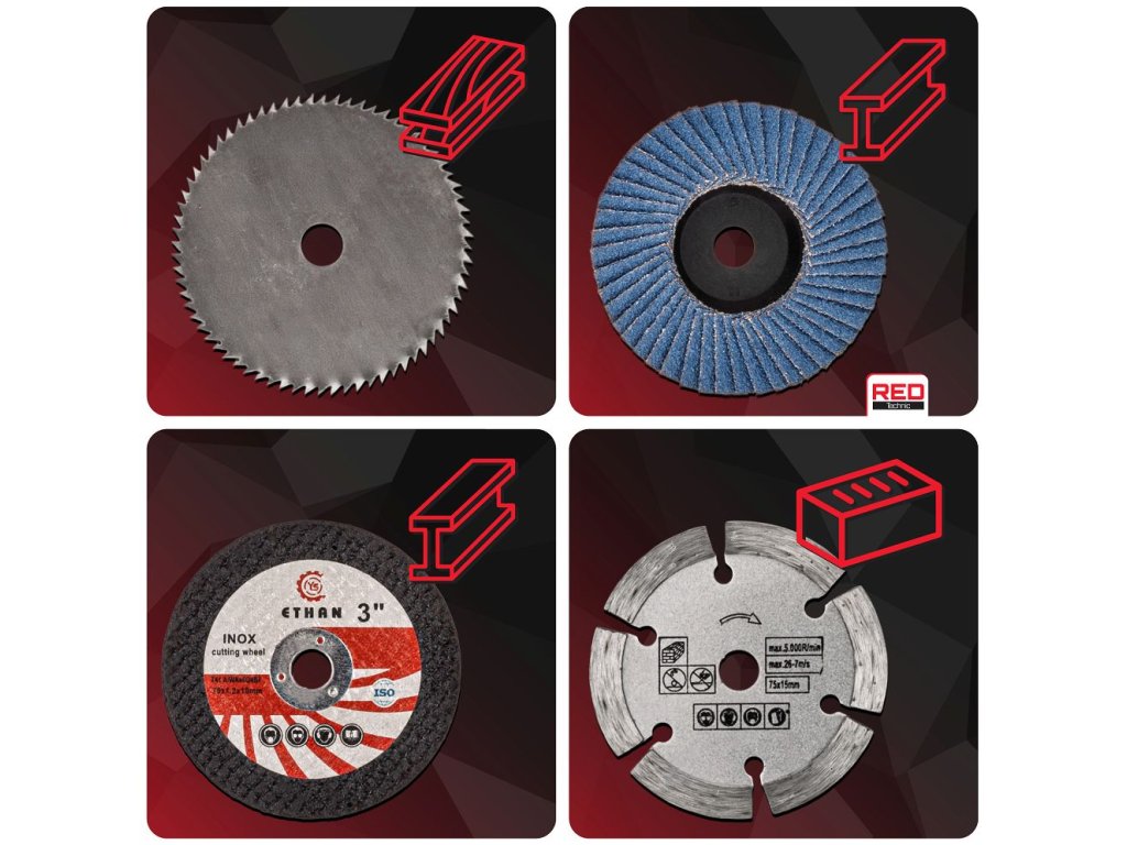 Sada kotoučů RED TECHNIC RTSZK0134-ZTA je univerzální příslušenství pro mini brusky, navržené pro řezání a broušení různých materiálů v jedné praktické sadě. Obsahuje 7 kotoučů o průměru 75 mm s montážním otvorem 10 mm, které umožňují práci s kovem, dřevem, betonem, cihlami i broušení svarů a povrchů. Díky použití kvalitních materiálů – oceli, fenolové pryskyřice vyztužené skelnými vlákny a diamantových segmentů – nabízí sada dlouhou životnost, vysoký řezný výkon a bezpečný provoz. Je plně kompatibilní s mini bruskami, včetně modelu RED TECHNIC RTSZK0134.