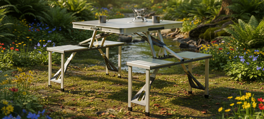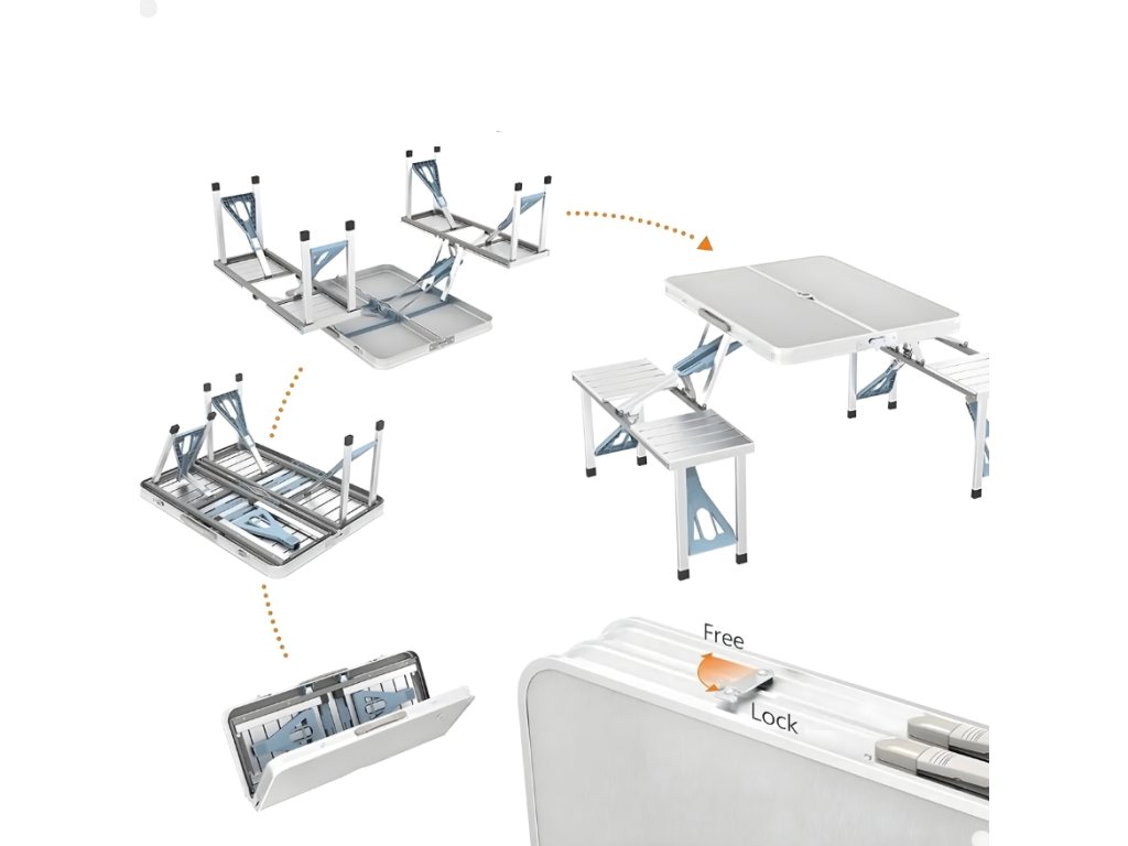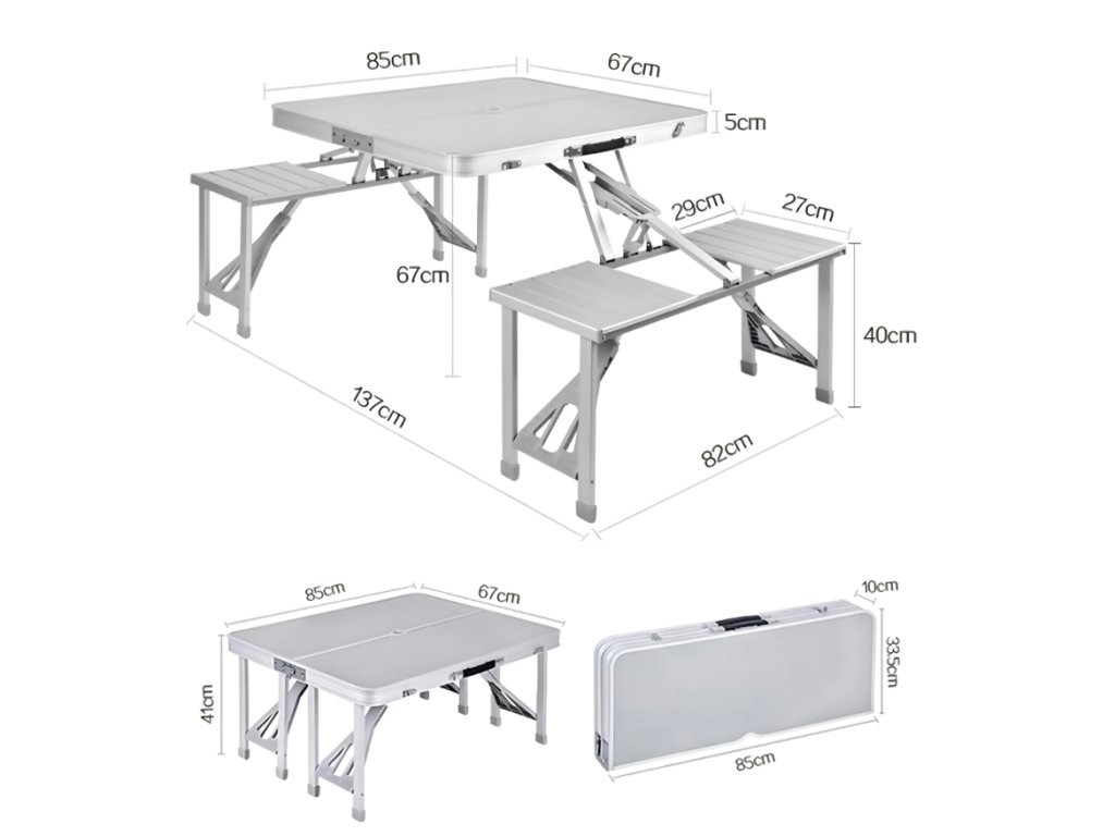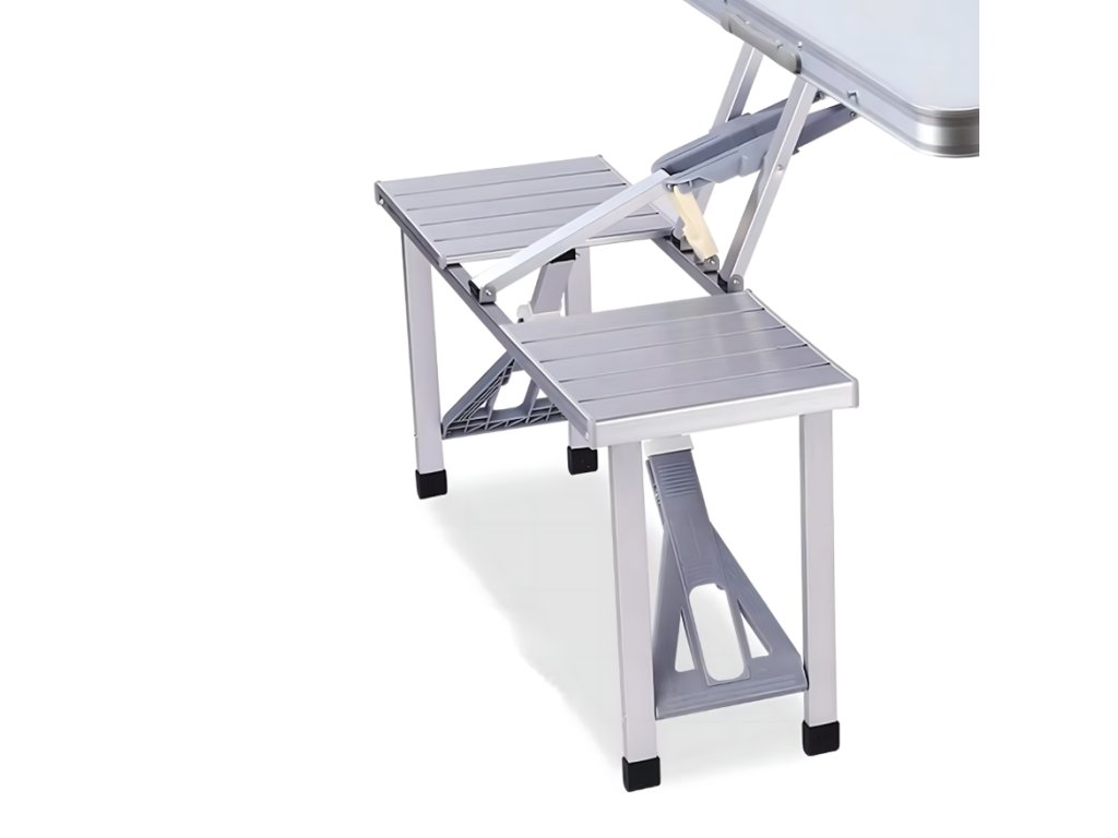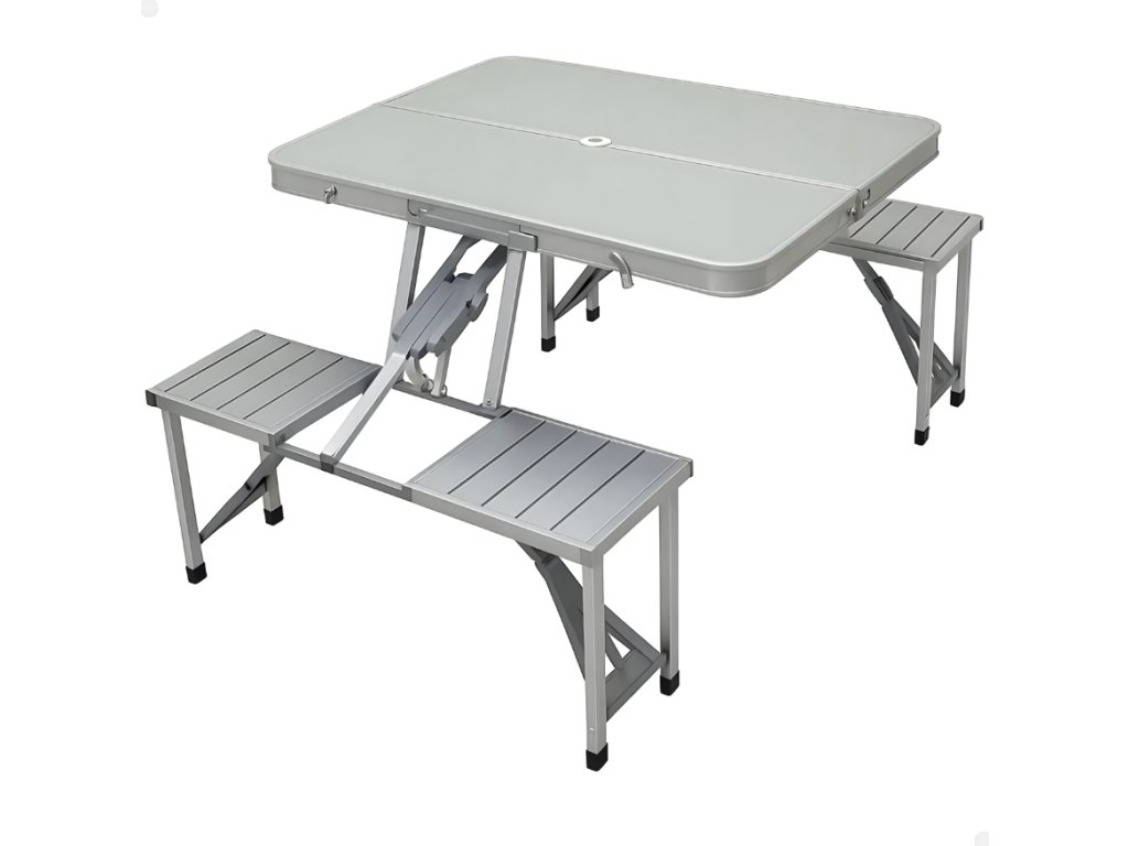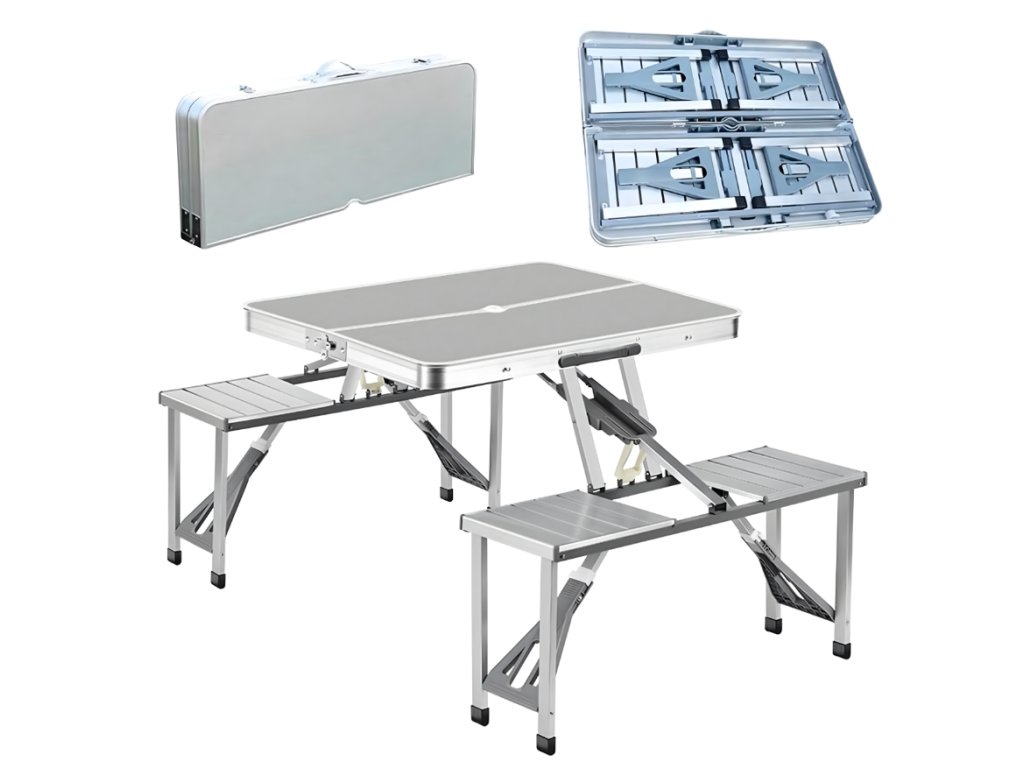 Praktická skládací kempingová sada obsahuje stůl a čtyři integrovaná sedátka, která po složení tvoří kompaktní kufr s rukojetí. Díky lehké, ale pevné konstrukci z hliníku a odolných materiálů je ideální pro cestování, kempování i zahradní posezení. Rychlé rozložení bez použití nářadí zajišťuje okamžitou připravenost k použití kdekoliv v terénu.