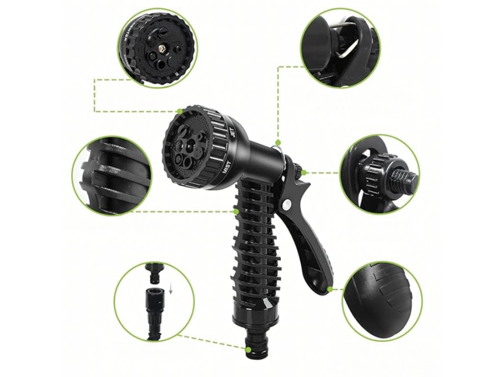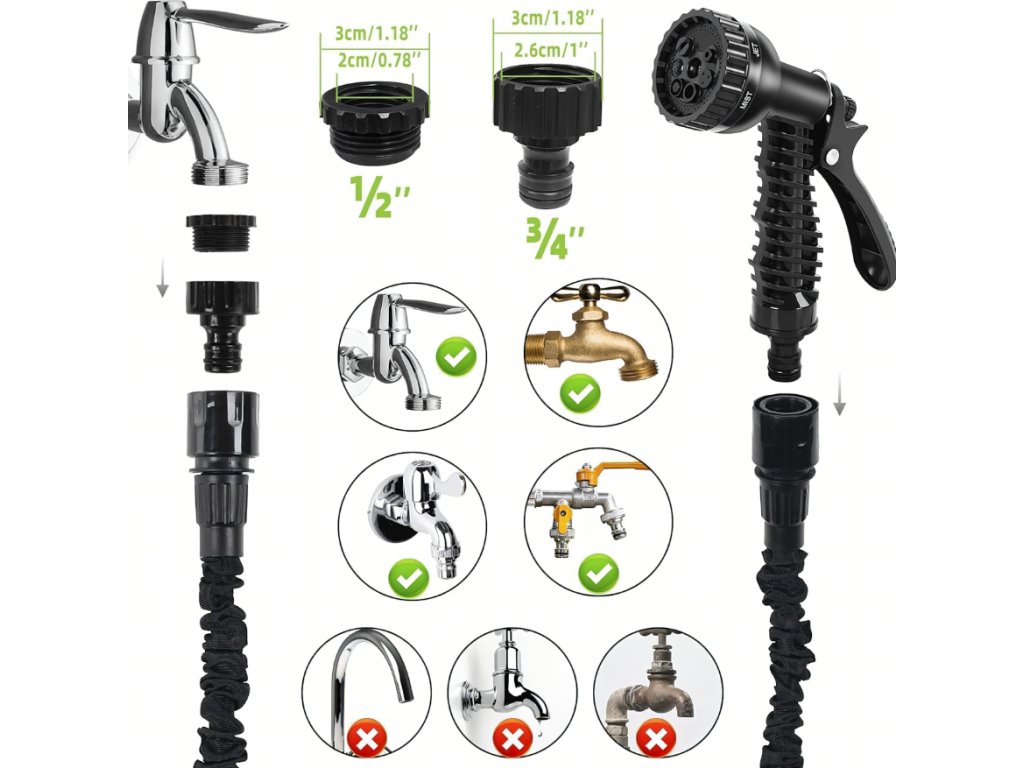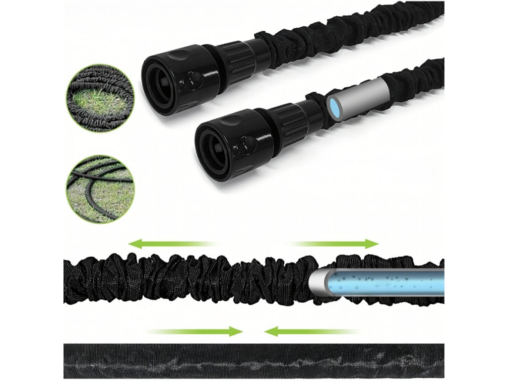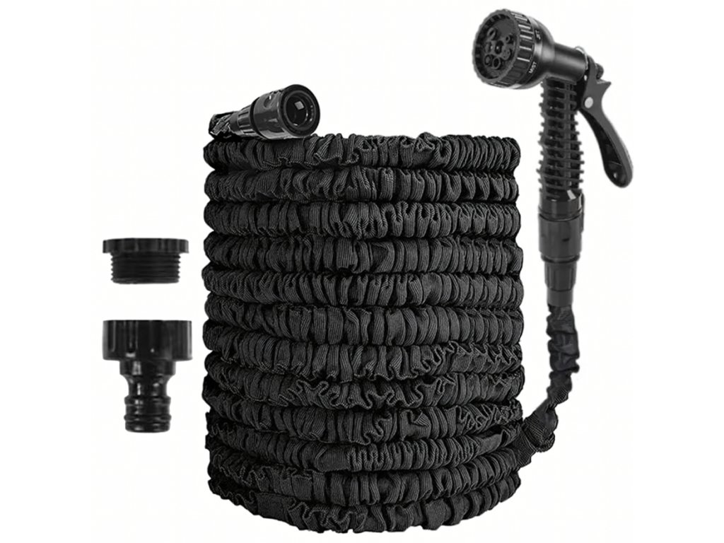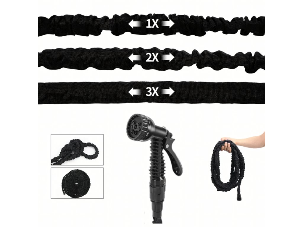Smršťovací zahradní hadice je praktická a lehká hadice, která se při naplnění vodou automaticky roztáhne až na délku 30 metrů a po vypuštění vody se opět smrští na původní velikost. Díky flexibilní konstrukci se snadno používá bez nepříjemného kroucení nebo zamotávání. Vnitřní trojité latexové jádro zajišťuje vysokou odolnost vůči tlaku a dlouhou životnost. Součástí balení je také 7funkční stříkací pistole, která umožňuje nastavit různé typy proudu vody podle aktuální potřeby – od jemné mlhy až po silný proud. Hadice je ideální pro zavlažování zahrady, mytí auta nebo čištění venkovních ploch.