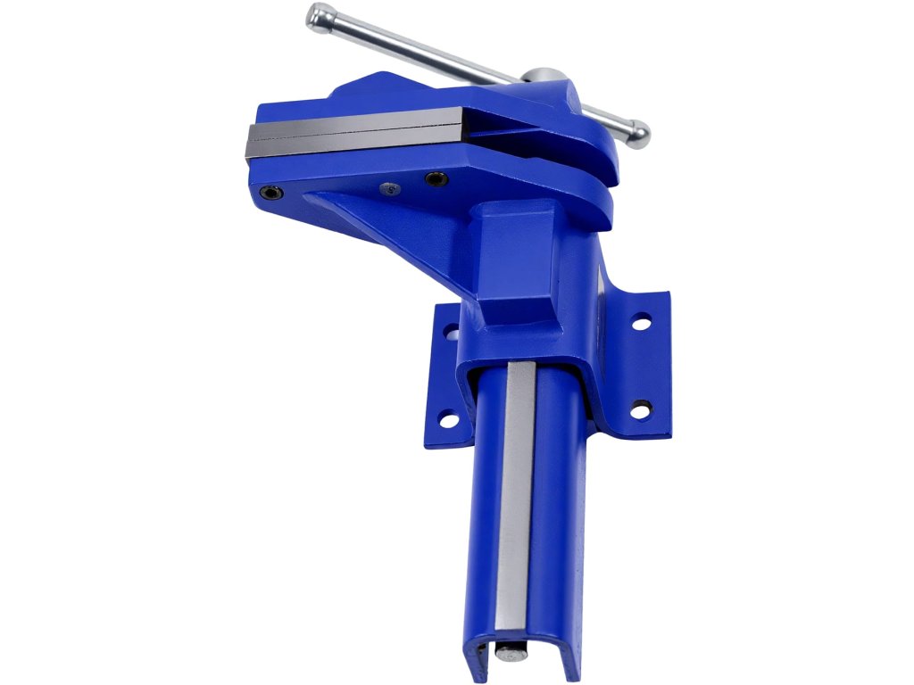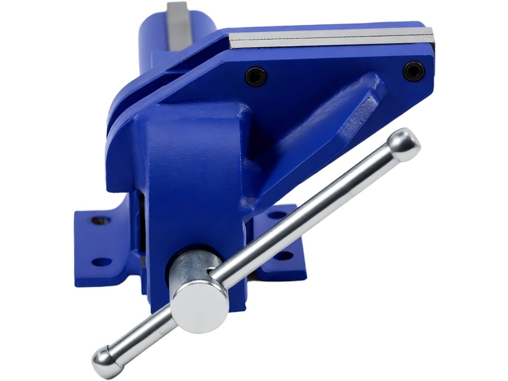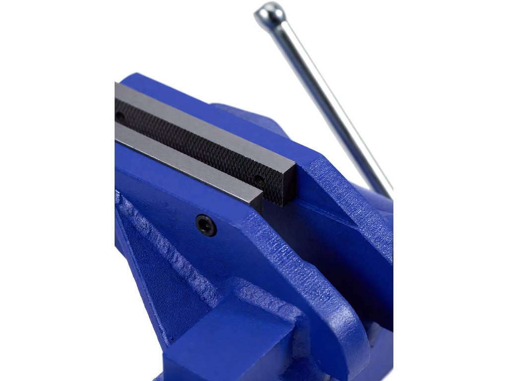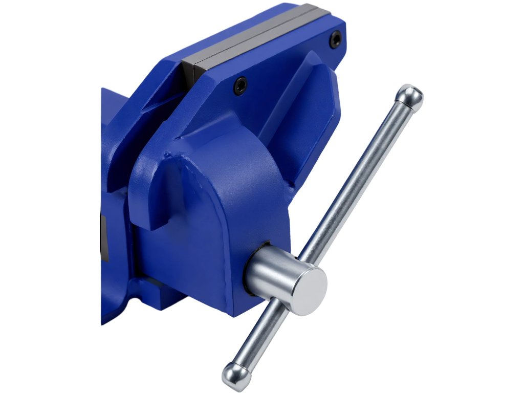 Tělo svěráku je opatřeno práškovým lakováním s kladivovým efektem, které chrání proti korozi a mechanickému poškození. Model je vybaven vyměnitelnými kalenými čelistmi o šířce 100 mm, které zajišťují pevné a bezpečné upnutí materiálu. Vodicí šroub umožňuje plynulé a přesné otevírání i zavírání čelistí.
