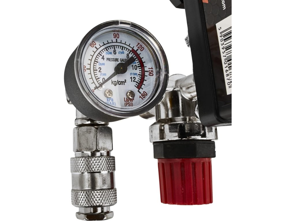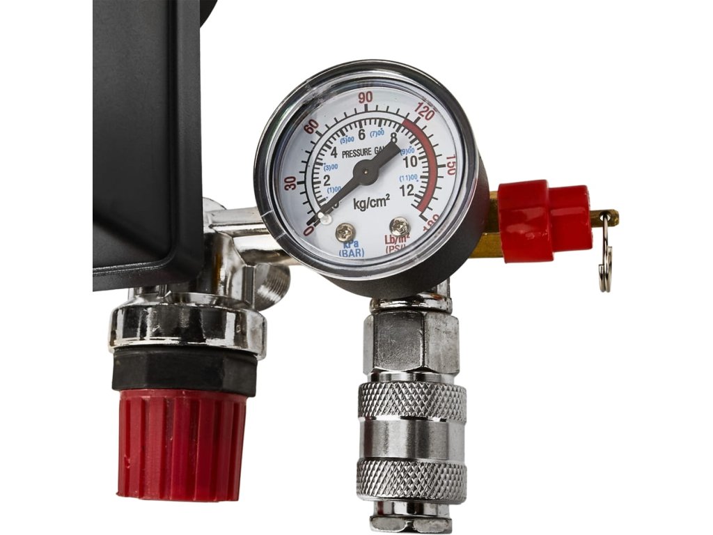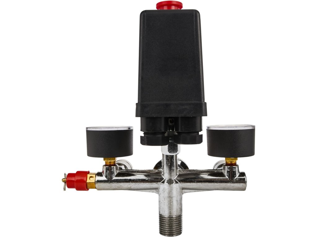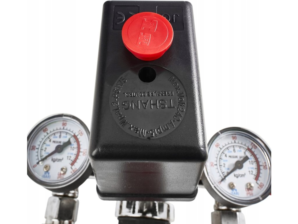 Zařízení automaticky zapne kompresor při poklesu tlaku a vypne jej při dosažení nastavené hodnoty. Díky tomu pracuje kompresor efektivněji, s nižší spotřebou energie a delší životností. Spínač je vybaven vestavěnými manometry, rychlospojkami, pojistným ventilem i hlavním vypínačem.