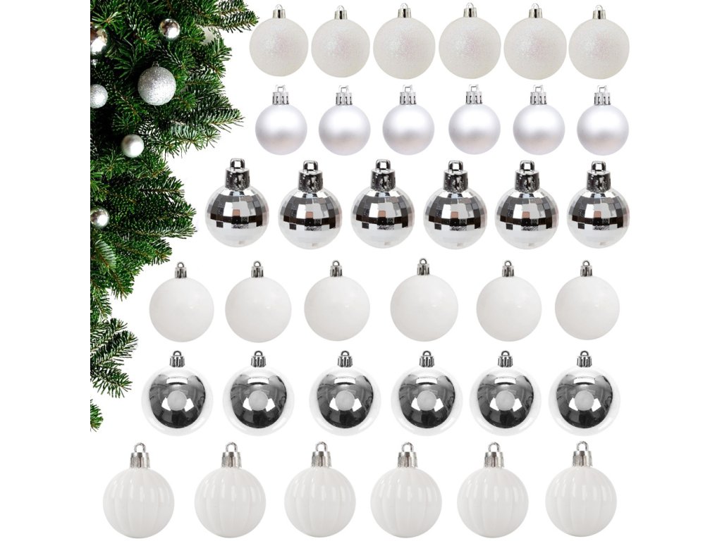 Elegantní sada vánočních ozdob obsahuje 36 kusů bílých a stříbrných koulí v různých designech, které dodají vašemu vánočnímu stromku vznešený a slavnostní vzhled. Kombinace matných, lesklých a třpytivých povrchů přináší do vašeho domova dokonalou rovnováhu mezi elegancí a vánočním kouzlem.