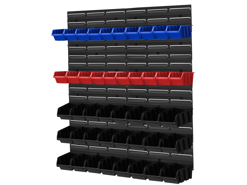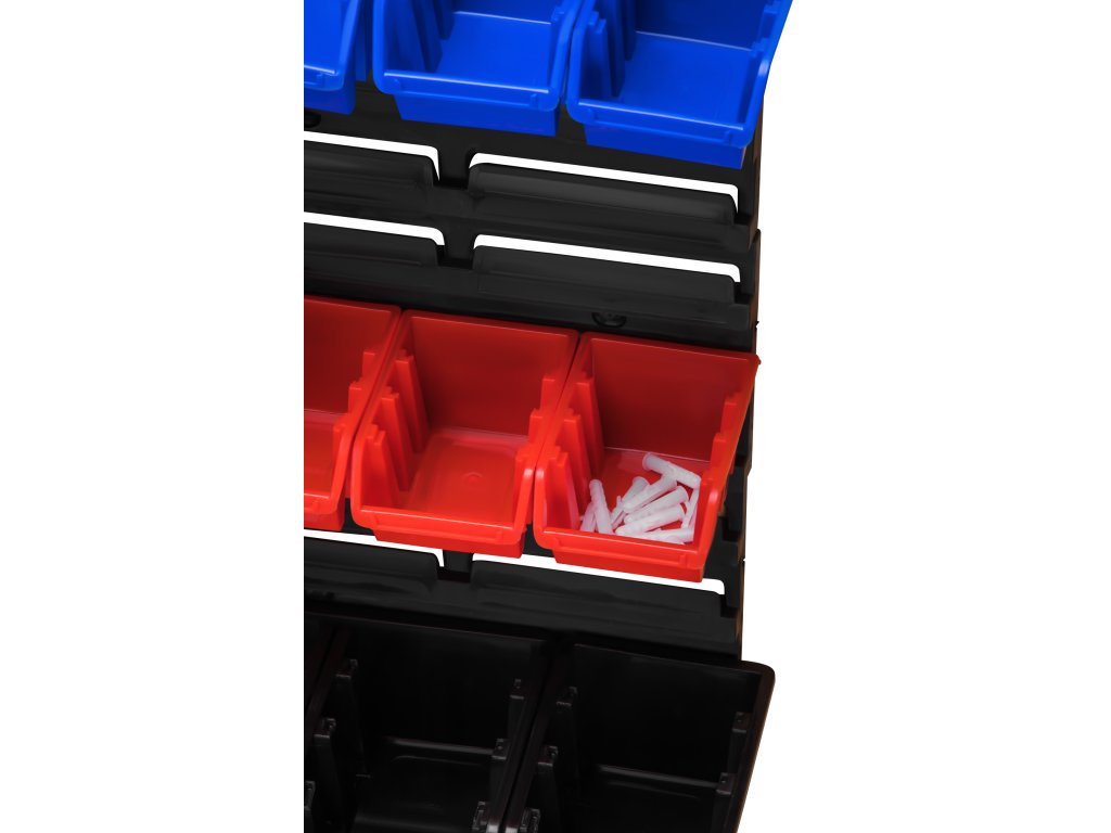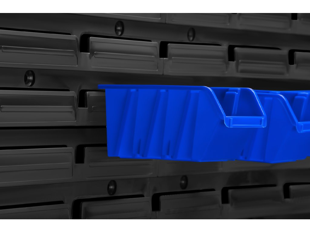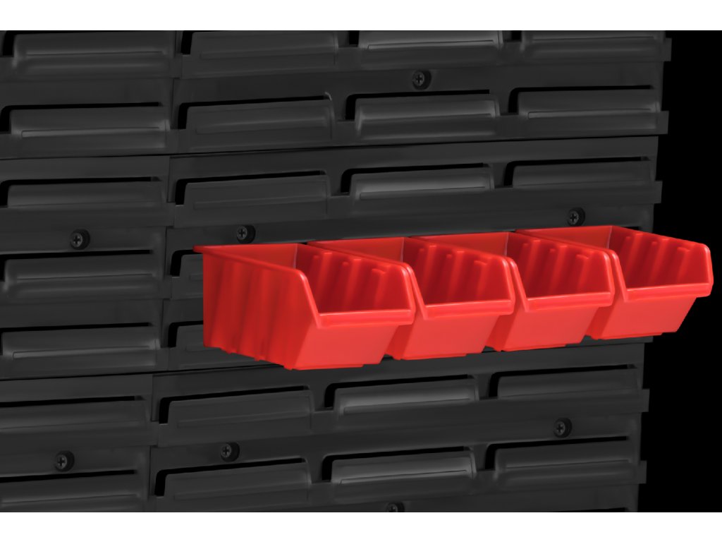 Systém je tvořen 12 samostatnými zadními deskami, které lze libovolně rozmístit a přizpůsobit prostoru. Celkem 82 stohovatelných kontejnerů různých velikostí poskytuje dostatek místa pro šrouby, matice, hmoždinky, spojovací materiál, elektroinstalační drobnosti i jiné malé díly.