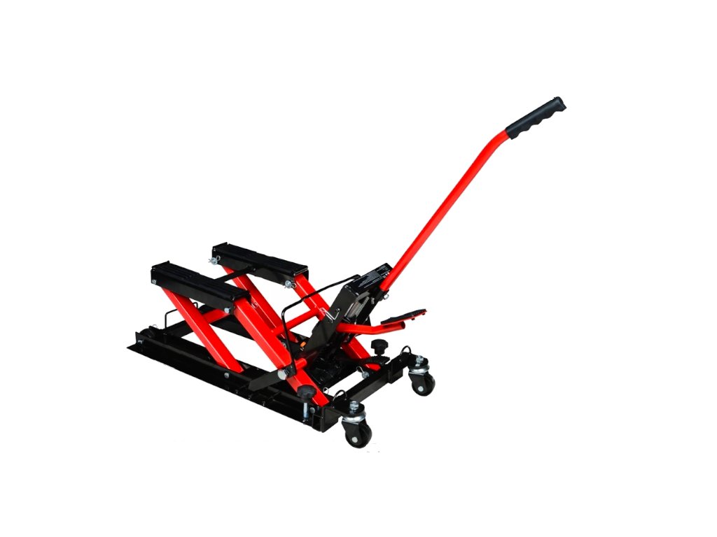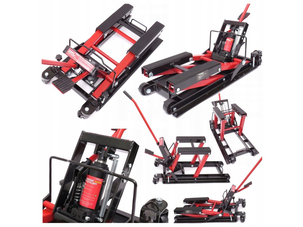 Zvedák na motorku a čtyřkolku hydraulický umožňuje díky své zesílené konstrukci snadné zvednutí motocyklu, čtyřkolky a dalších. Držáky jsou vybaveny protiskluzovou gumou, aby se zabránilo poškození. Pohodlný pedál pro jednoduché zvedání a uvolňování.